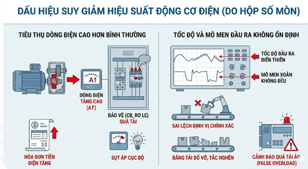 Khi bánh răng của bộ hộp số giảm tốc bị mòn, ma sát tăng lên đáng kể, làm thay đổi đặc tính tải của motor.