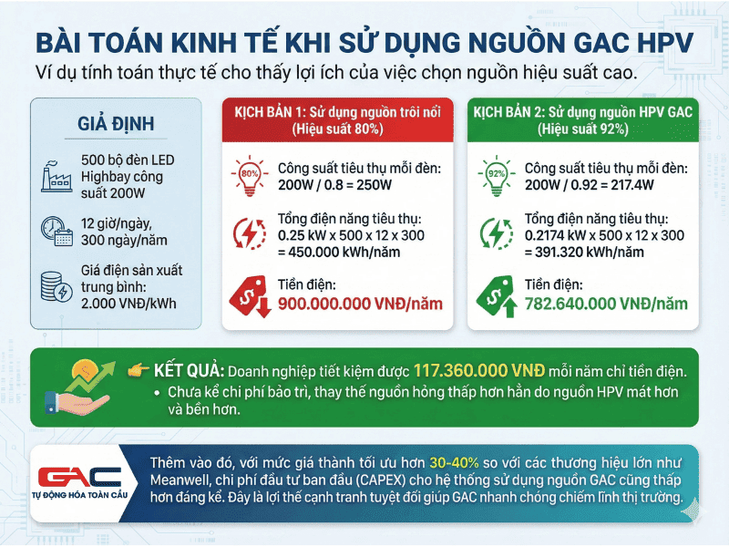 👉 Kết quả: Doanh nghiệp tiết kiệm được 117.360.000 VNĐ mỗi năm chỉ tiền điện. Chưa kể chi phí bảo trì, thay thế nguồn hỏng thấp hơn hẳn do nguồn HPV mát hơn và bền hơn.