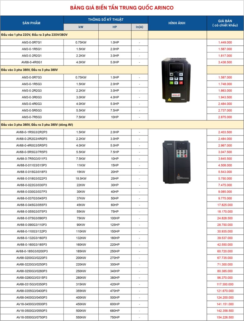 II. Bảng giá biến tần Arinco mới nhất 2026