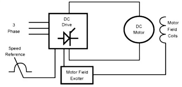 - Nguồn AC → chỉnh lưu DC → điều chỉnh điện áp phần ứng → dòng phần ứng thay đổi → mô-men và tốc độ thay đổi → dòng kích từ duy trì từ thông.