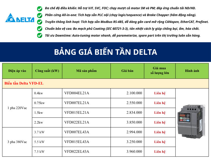 Để nhận bảng giá biến tần Delta, quý khách vui lòng Click Zalo liên hệ báo giá, đội ngũ Kinh Doanh của chúng tôi sẽ gửi bảng giá chiết khấu biến tần Delta cùng dịch vụ hậu mãi và mức giá tốt nhất cho từng quý khách hàng.