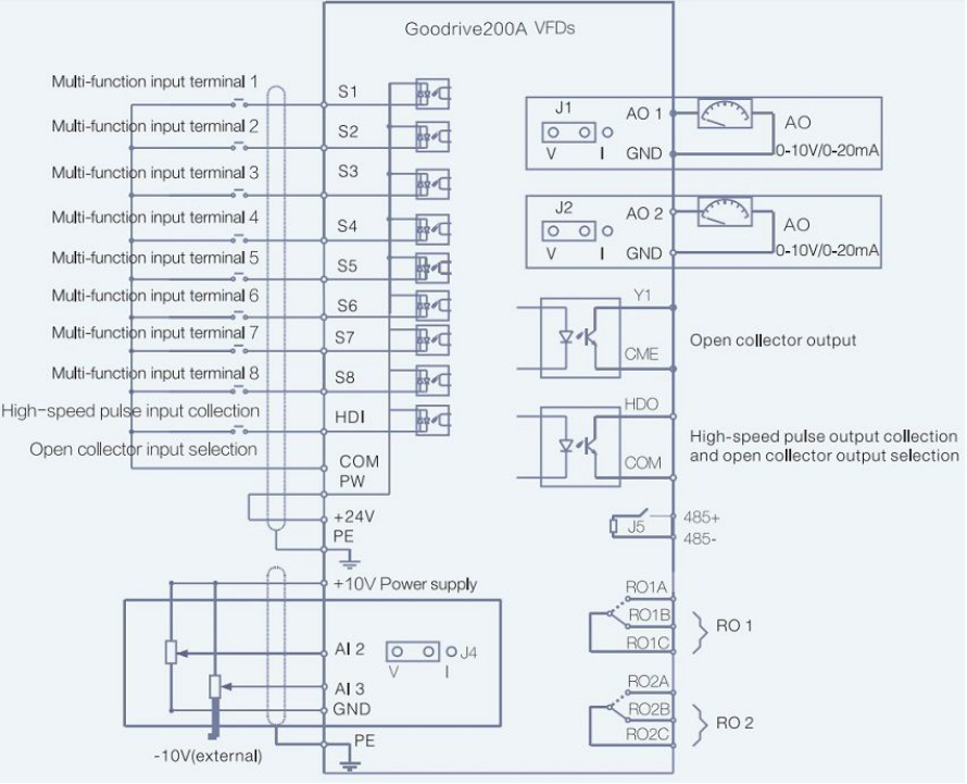 Sơ đồ đấu dây mạch điều khiển biến tần INVT GD200A Series: