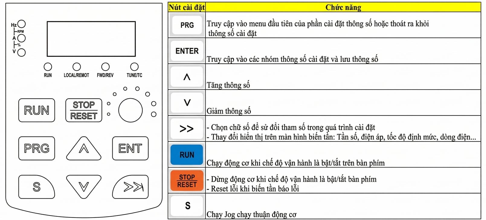| F01 | Nhóm chức năng cơ bản | Nguồn lệnh chạy, nguồn tần số, giới hạn tần số trên/dưới |