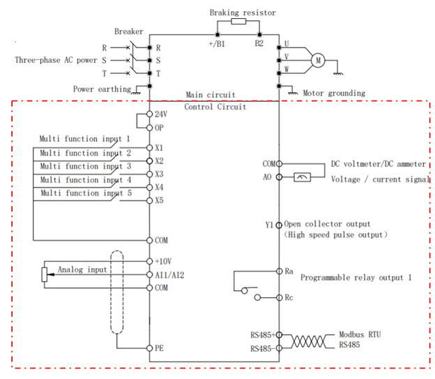 Đầu ra: Relay (TA/TB/TC) hoặc Transistor (Y/DO) để báo trạng thái lỗi hoặc trạng thái chạy.