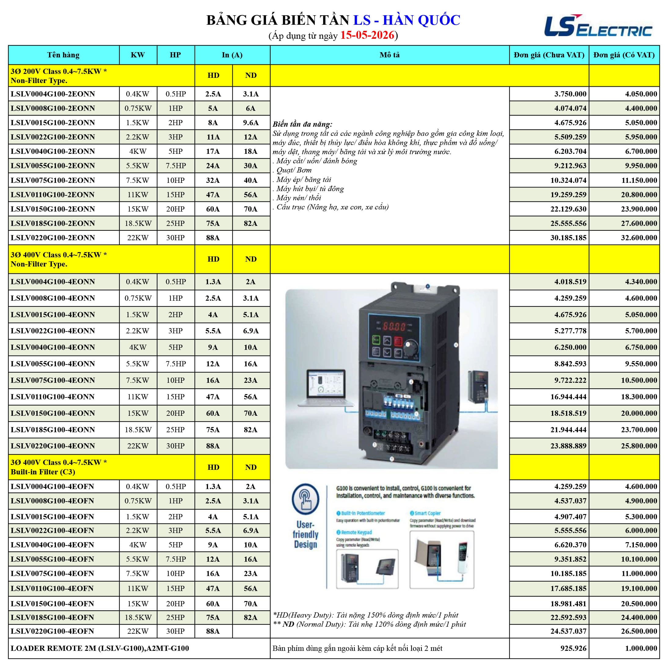 | LS H100 | Dòng chuyên dụng cho quạt và bơm, tối ưu tiết kiệm năng lượng, HVAC và xử lý nước. | Quạt công nghiệp, bơm công nghiệp, HVAC, xử lý nước, xây dựng, dầu khí, giấy, mỏ than. |