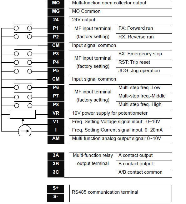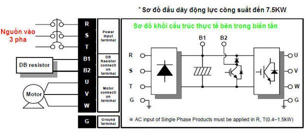 Đấu dây biến tần LS được chia thành 2 phần là đấu dây động lực và đấu dây điều khiển. Được thực hiện như sau: