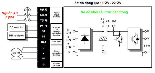 Ở cách đấu này, nếu là nguồn 3 pha sẽ là 3 cực R, S, T. Trường hợp 1 pha là R, T. Trong đó, động cơ sẽ được đấu vào U, V, W. Và các điểm B1, B2 làm nhiệm vụ gắn điện trở hãm động năng. Đối với loại biến tần LS có công suất 11kW đến 22kW sẽ có thêm cuộn kháng DC. Cách đấu dây động lực được thực hiện theo sơ đồ dưới đây: