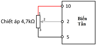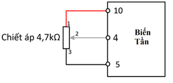 – Cách đấu nối cho chiết áp ngoài số 2: nối chân số 4 của chiết áp vào chân số 4 trên mạch điều khiển biến tần. Hai chân còn lại của chiết áp nối với chân số 10 và số 5. Nếu như giá trị của chiết áp bị ngược chiều thì chỉ cần đảo hai chân 10 và 5.