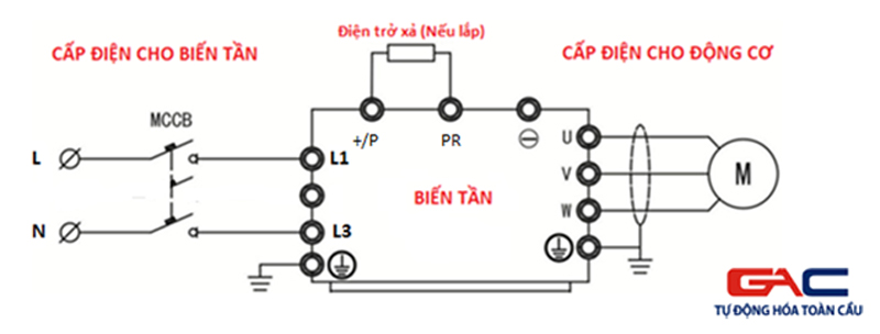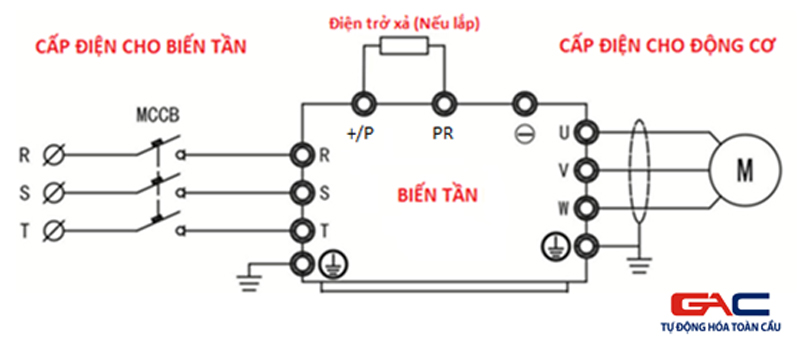 Đầu vào 3 pha 380V cấp vào các chân R, S, T hoặc L1, L2, L3 của biến tần; 3 pha đầu ra của biến tần U, V, W nối với động cơ. Biến tần có 2 chân PE để nối đất thiết bị.