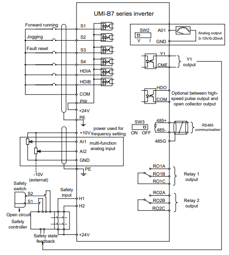 AI1, AI2 nhận 0–10V hoặc 0–20mA (cài qua jumper/switch). GND là chân chung analog. - Đầu ra rơ-le: RO1A/B/C, RO2A/B/C báo trạng thái hoặc lỗi.