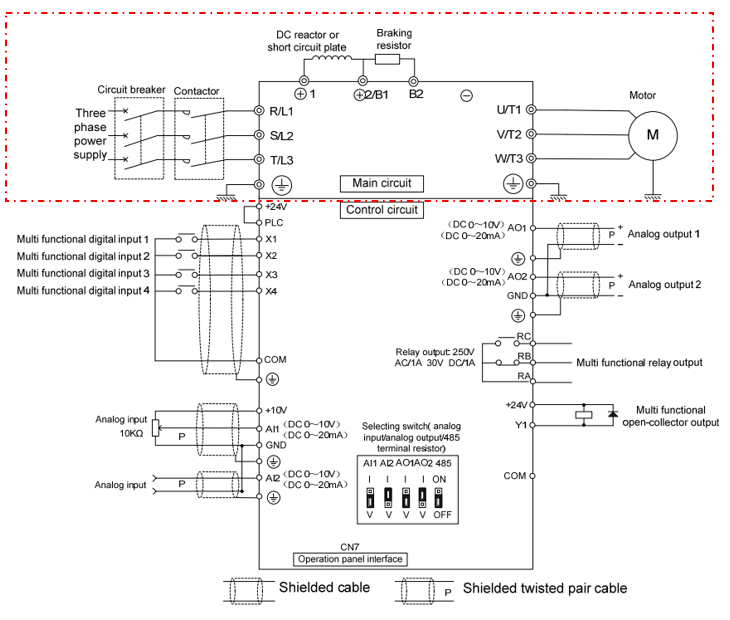Một số dòng công suất lớn có cầu đấu (+)1 và (+)2 dành cho cuộn kháng DC.