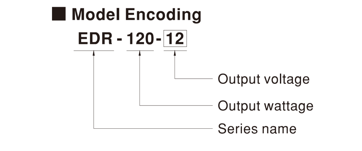 • MDR, NDR, EDR, HDR, SDR: Dòng nguồn gắn thanh ray (DIN Rail) lắp trong tủ điện. (VD: EDR là dòng kinh tế, NDR là dòng tiêu chuẩn, SDR là dòng cao cấp kích thước nhỏ).