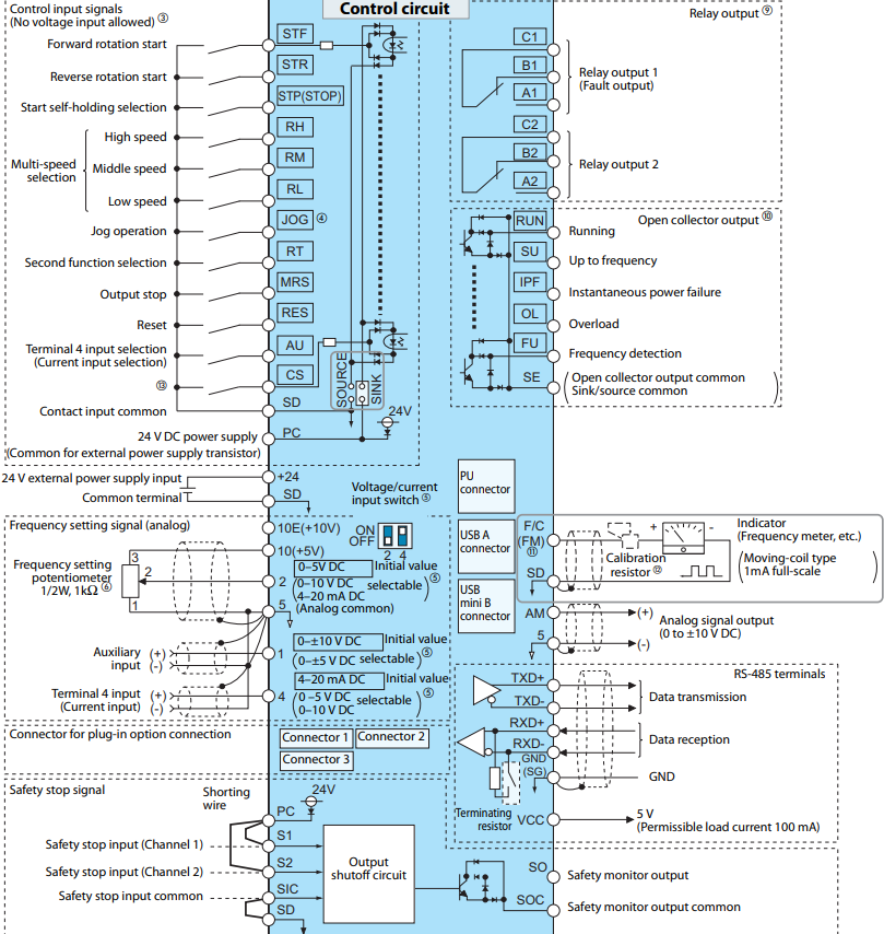 • STF (Forward): Chạy thuận. Khi chân STF được nối với chân SD, biến tần sẽ bắt đầu quay thuận.