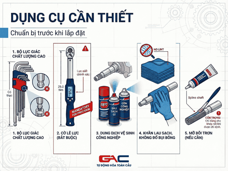 Trước khi bắt đầu thao tác lắp hộp số giảm tốc, kỹ thuật viên cần chuẩn bị đầy đủ dụng cụ và kiểm tra thiết bị.