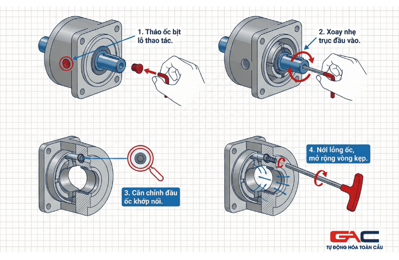 • Lưu ý đặc biệt cho dòng GAC: Một số dòng hộp số cao cấp của GAC có thiết kế 2 bu lông kẹp đối xứng để đạt cân bằng động. Nếu gặp loại này, bạn phải siết luân phiên 2 ốc (mỗi lần một chút) cho đến khi đạt lực yêu cầu. Điều này giúp ngăn ngừa trượt trục và đảm bảo truyền động zero backlash.