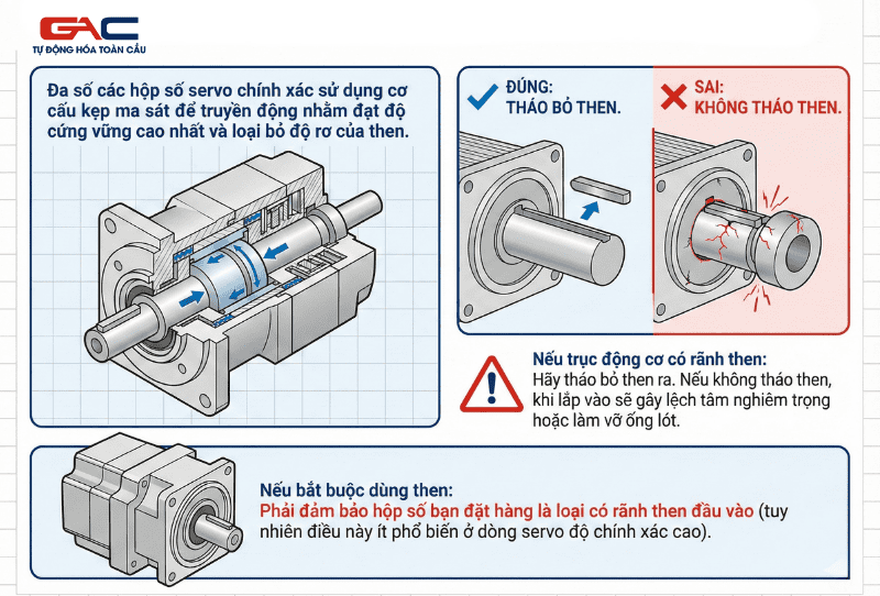 • Nếu bắt buộc dùng then: Phải đảm bảo hộp số bạn đặt hàng là loại có rãnh then đầu vào (tuy nhiên điều này ít phổ biến ở dòng servo độ chính xác cao).