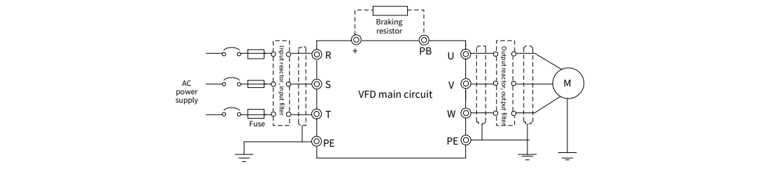 Bước 3: Nối các thiết bị tùy chọn như điện trở hãm (kèm theo cáp kết nối) vào các vị trí đầu nối được chỉ định trên biến tần.