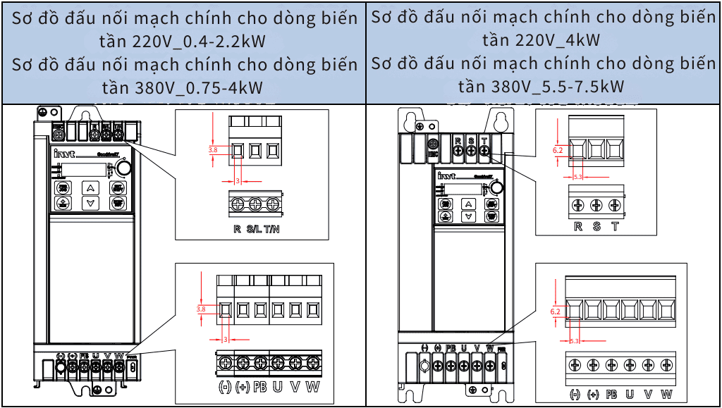 - R/L, S, T/N: ngỏ vào AC, R/S/T – ngỏ vào 3 pha, L/N – ngỏ vào 2 pha.
