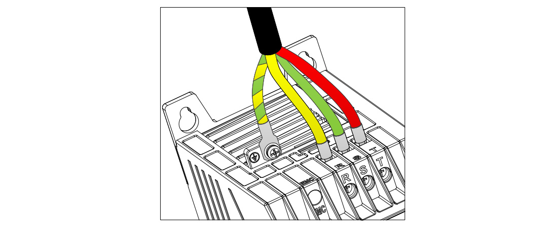Bước 1:Nối dây tiếp địa màu vàng – xanh của cáp nguồn đầu vào vào cọc tiếp địa của biến tần (VFD), sau đó đấu cáp nguồn 3 pha vào các đầu R, S, T và siết chặt các đầu nối.