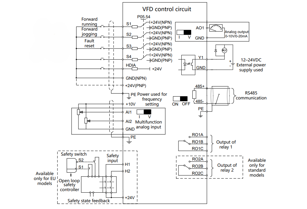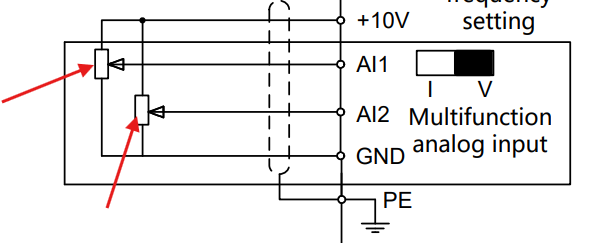 Nếu sử dụng nút nhấn ngoài hoặc biến trở, hãy đấu nối vào các chân S1, S2, S3, S4, COM và chân AI1, AI2, +10V, GND.