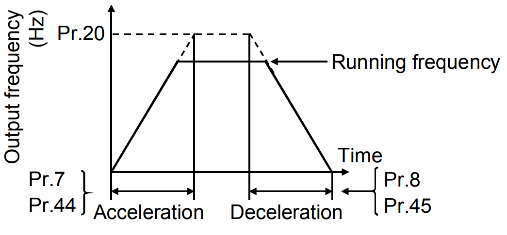 | Pr. 7 | Acceleration time | 5 s / 10 s | Thời gian tăng tốc (0–3600 s) |