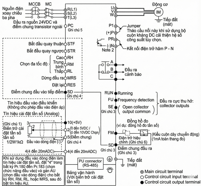 Việc đấu nối đúng sơ đồ là nền tảng để quá trình cài đặt biến tần Mitsubishi E500 diễn ra an toàn và chính xác.