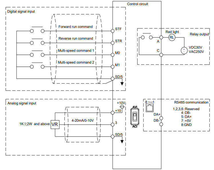 • 3: Ngõ vào Analog (0–10V hoặc 4–20mA, chọn bằng công tắc AVI/ACI).