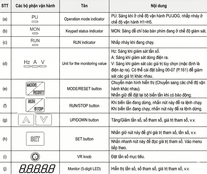 Dùng 2 nút nhấn giữ (công tắc xoay) đấu vào chân STF (Chạy thuận) và STR (Chạy nghịch) để điều khiển. Tần số cài đặt trực tiếp trên bàn phím (núm xoay).