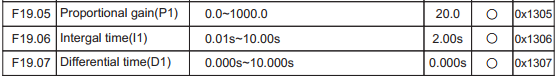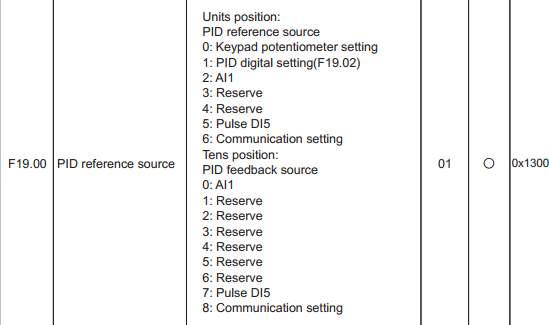 - CÀI F19.00=01 (LỰA CHỌN TÍN HIỆU PID PHẢN HỒI VỀ ĐẦU VÀO ANALOG AI1 VÀ GIÁ TRỊ ĐẶT PID THEO THÔNG SỐ F19.02)