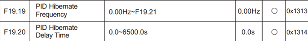- CÀI TẦN SỐ NGỦ ĐÔNG F19.19 (KHI TẦN SỐ ĐẦU RA PID NHỎ HƠN TẦN SỐ F19.19, SAU THỜI GIAN TRỄ CÀI THEO F19.20 THÌ BIẾN TẦN SẼ DỪNG LẠI. TẦN SỐ NGỦ ĐÔNG NÀY XÁC ĐỊNH BẰNG CÁCH ĐỂ CHO HỆ THỐNG CHẠY PID Ở GIÁ TRỊ ĐẶT RỒI XEM GIÁ TRỊ TẦN SỐ OUT RA DUY TRÌ Ở GIÁ TRỊ BAO NHIÊU, TỪ ĐÓ SẼ LẤY GIÁ TRỊ ĐÓ ĐỂ CÀI CHO F19.19)