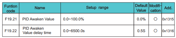 - CÀI GIÁ TRỊ THỨC DẬY CỦA BIẾN TẦN KHI Ở TRẠNG THÁI NGỦ ĐÔNG THEO PHẦN TRĂM GIÁ TRỊ ĐẶT: 21. NẾU F19.21 DUY TRÌ TRONG THỜI GIAN CÀI Ở F19.22 THÌ BIẾN TẦN THỨC DẬY (BIẾN TẦN RUN)
