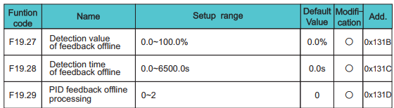 - CÀI CHỨC NĂNG PHÁT HIỆN MẤT TÍN HIỆU CẢM BIẾN ĐỂ BIẾN TẦN DỪNG. KHI GIÁ TRỊ PID PHẢN HỒI THẤP HƠN GIÁ TRỊ 27x(GIÁ TRỊ ĐẶT PID) TRONG KHOẢNG THỜI GIAN F19.28 THÌ BIẾN TẦN SẼ THỰC HIỆN THAO TÁC Ở F19.29