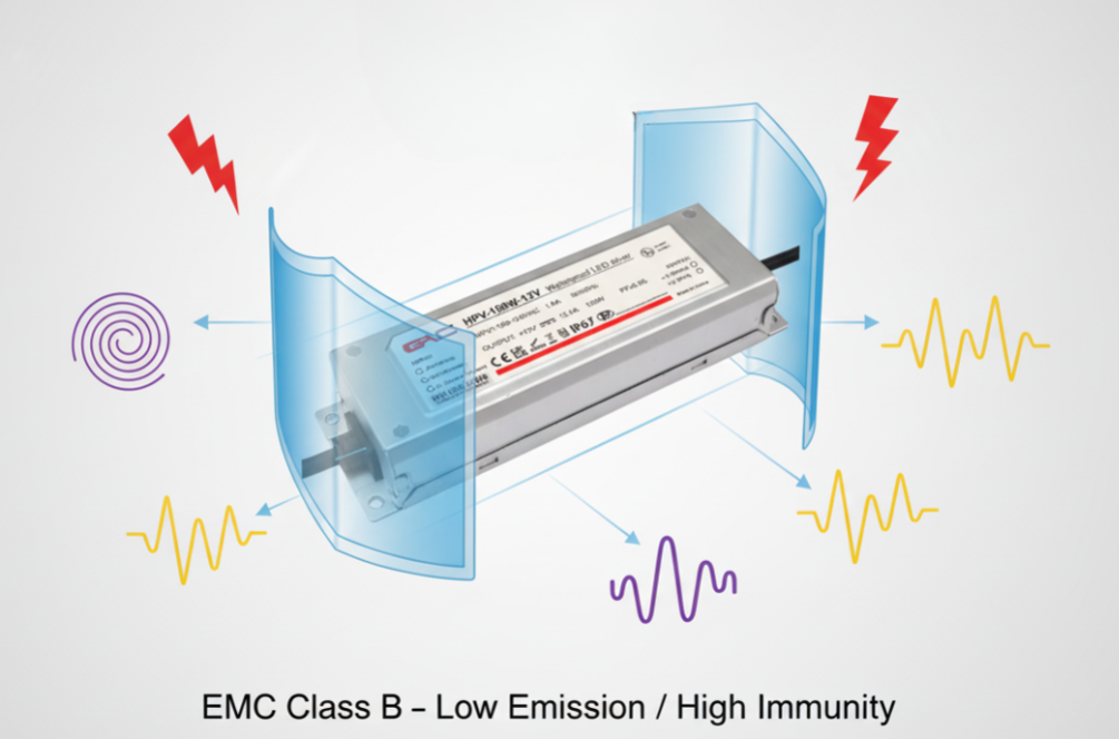 Để đảm bảo thiết bị vận hành ổn định, bộ nguồn cần đạt các chuẩn EMC (Electromagnetic Compatibility) nghiêm ngặt – vừa chống nhiễu phát ra, vừa chịu được nhiễu từ bên ngoài mà vẫn giữ điện áp ổn định.