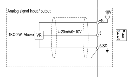 • Đầu vào AI1 của biến tần Shihlin có thể nhận tín hiệu 0-10V hoặc 4-20mA