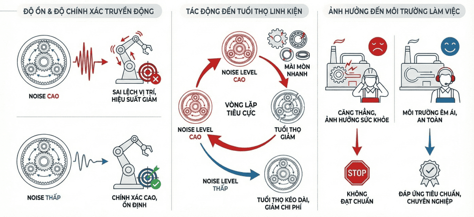 Việc kiểm soát tốt Noise Level giúp giảm tải động, kéo dài tuổi thọ của hộp số giảm tốc hành tinh và giảm chi phí bảo trì, thay thế linh kiện.
