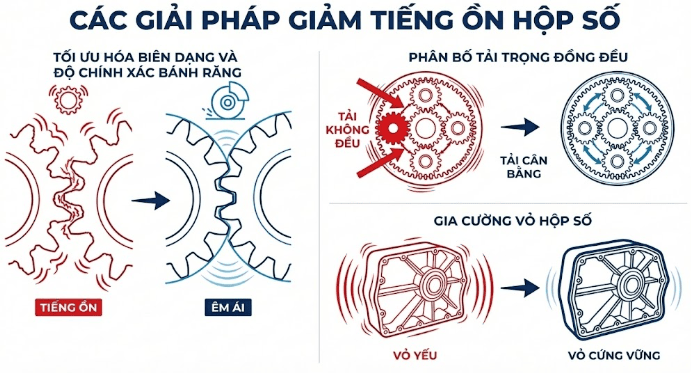 Vỏ hộp số không chỉ có nhiệm vụ bảo vệ các chi tiết bên trong mà còn đóng vai trò giảm rung và hấp thụ dao động. Vỏ có độ cứng thấp hoặc thiết kế mỏng sẽ dễ bị cộng hưởng, khuếch đại rung động cơ học thành âm thanh nghe được.