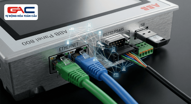 Một điểm rất quan trọng của HMI ABB công nghiệp là khả năng giao tiếp với các thiết bị khác. Các cổng truyền thông như Ethernet, RS232, RS485 hoặc các giao thức công nghiệp cho phép HMI đọc và ghi dữ liệu từ PLC, biến tần, bộ điều khiển nhiệt độ hay các thiết bị giám sát khác. Đây là nền tảng để tạo nên một hệ thống vận hành đồng bộ.
