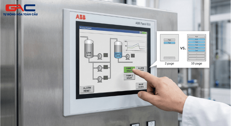 Ngoài ra, các nút điều khiển quan trọng như Start, Stop, Reset hoặc chọn chế độ cần được đặt ở vị trí dễ thao tác nhưng tránh nhấn nhầm. Với hệ thống có nguy cơ cao, nên có bước xác nhận lệnh hoặc phân quyền truy cập bằng mật khẩu. Đây là điểm then chốt trong thiết kế giao diện vận hành ABB theo hướng chuyên nghiệp và an toàn.