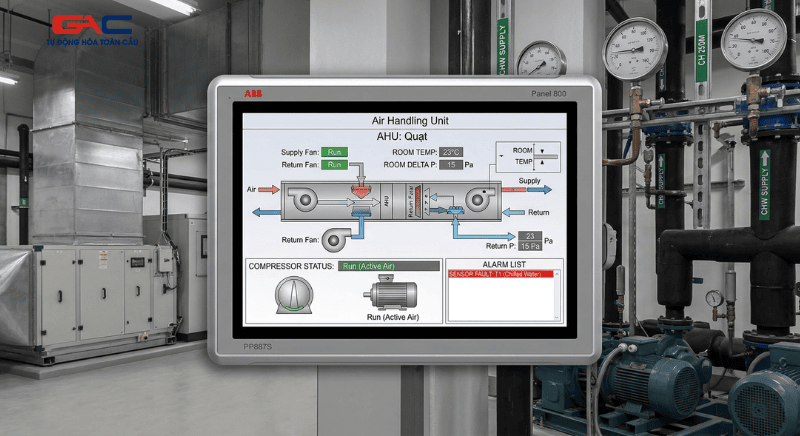 Ở hệ thống HVAC, HMI hỗ trợ giám sát nhiệt độ phòng, áp suất chênh lệch, trạng thái quạt cấp, quạt hồi, van điều tiết và cảnh báo lỗi cảm biến. Với các hệ thống phụ trợ như máy nén khí, chiller hoặc xử lý nước, HMI tiếp tục đóng vai trò trung tâm hiển thị giúp người vận hành nắm nhanh tình trạng toàn bộ cụm thiết bị.