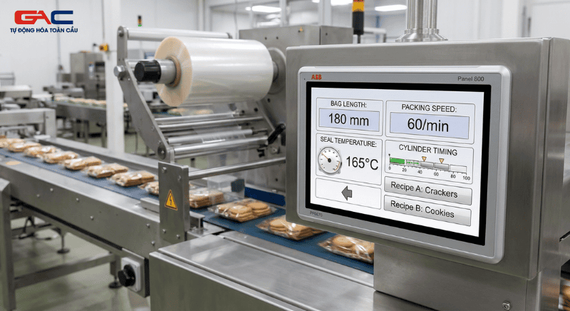 Ở các máy đóng gói, HMI thường được dùng để cài đặt chiều dài túi, tốc độ đóng gói, nhiệt độ thanh hàn và thời gian tác động xilanh. Đây là ứng dụng tiêu biểu cho thấy màn hình HMI ABB hỗ trợ vận hành linh hoạt như thế nào. Khi thay đổi loại sản phẩm, người dùng chỉ cần thay đổi bộ thông số trên giao diện thay vì chỉnh cơ khí phức tạp.