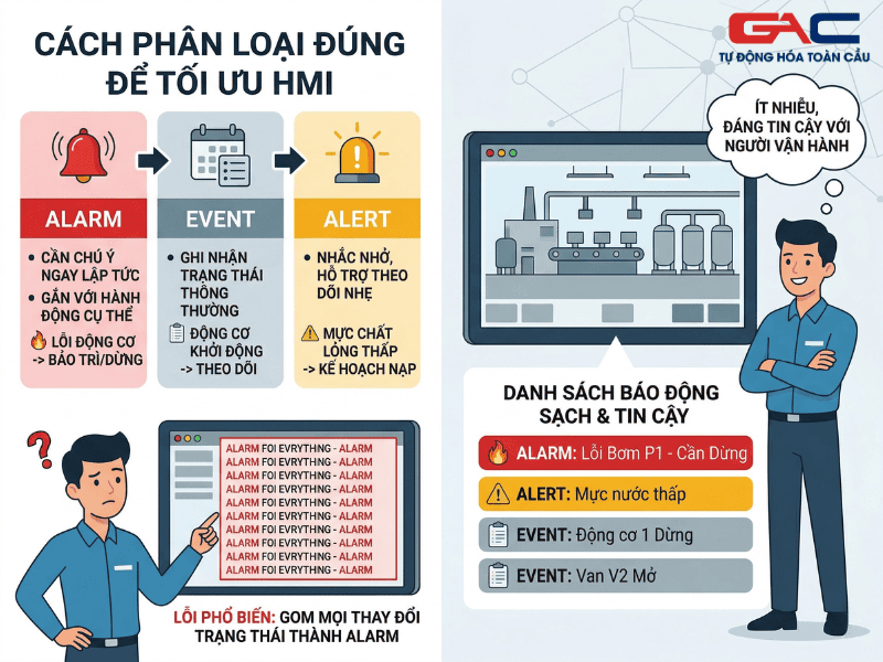 Một trong những lỗi phổ biến là gom mọi thay đổi trạng thái thành alarm. Trên thực tế, alarm là tín hiệu cần được chú ý và thường gắn với hành động cụ thể. Event là sự kiện ghi nhận trạng thái, như động cơ khởi động hoặc van đóng mở. Alert thường nhẹ hơn, mang tính nhắc nhở hoặc hỗ trợ theo dõi. Khi phân biệt rõ, hệ thống hmi alarm sẽ sạch hơn, ít nhiễu hơn và đáng tin cậy hơn với người vận hành.
