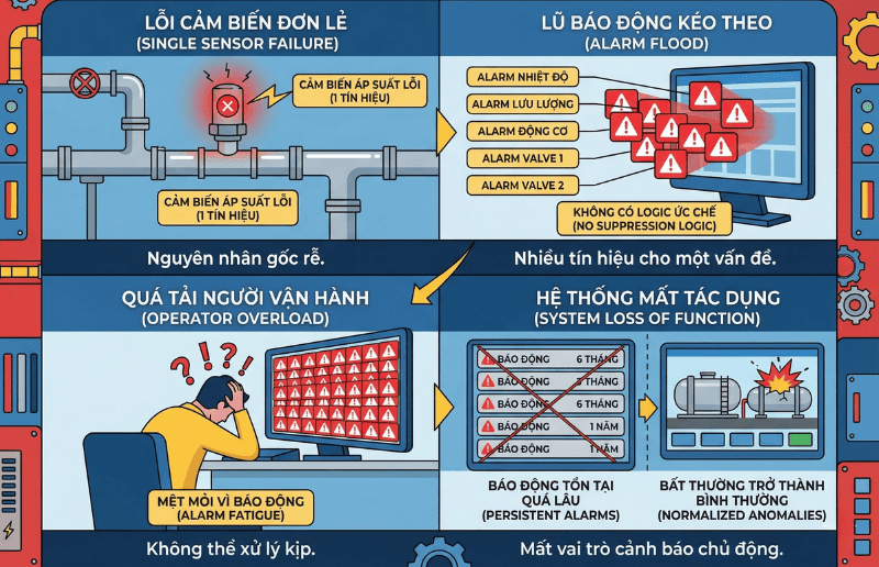 Alarm flood là tình trạng quá nhiều alarm xuất hiện trong thời gian ngắn, khiến người vận hành không biết đâu là nguyên nhân gốc. Đây là vấn đề rất thường gặp khi hệ thống thiếu rationalization hoặc mọi tín hiệu đều được cấu hình thành alarm. Cùng với đó, báo động giả hoặc alarm lặp đi lặp lại sẽ làm giảm niềm tin vào hệ thống.