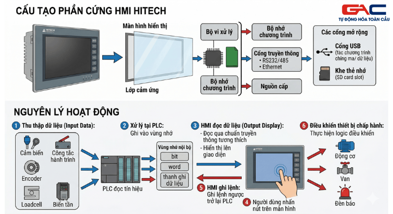 Để hiểu và khai thác đúng HMI Hitech, cần nhìn nó dưới góc độ một thiết bị điện tử công nghiệp có khả năng xử lý giao diện và truyền thông dữ liệu. Một màn hình HMI thường bao gồm màn hình hiển thị, lớp cảm ứng, bộ vi xử lý, bộ nhớ chương trình, cổng truyền thông và nguồn cấp. Một số model còn có cổng USB hoặc khe thẻ nhớ để nạp chương trình, sao lưu dữ liệu hoặc cập nhật cấu hình.
