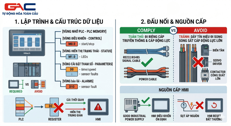 Trong triển khai thực tế, rất nhiều sự cố không đến từ phần cứng mà đến từ cách lập trình hoặc đấu nối sai nguyên tắc. Khi làm việc với HMI Hitech, kỹ sư nên xây dựng cấu trúc dữ liệu logic ngay từ đầu. Các vùng nhớ điều khiển, hiển thị trạng thái, cài đặt tham số và báo lỗi cần được phân tách rõ ràng để thuận tiện cho cả lập trình PLC lẫn giao diện HMI.