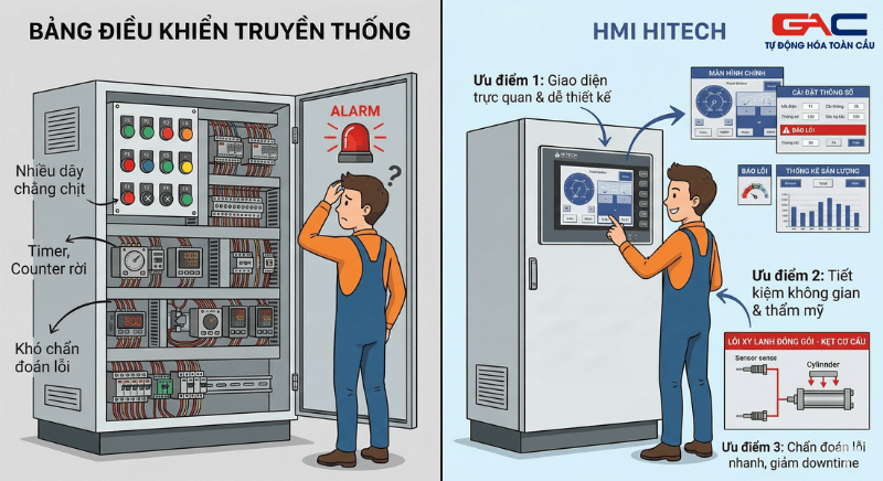 Khi xét ở góc độ vận hành và tích hợp hệ thống, HMI Hitech thường được đánh giá cao ở tính trực quan, khả năng thay thế các phần tử hiển thị rời và mức độ linh hoạt trong lập trình giao diện. Đây là lý do nhiều đơn vị chế tạo máy lựa chọn HMI thay cho bảng nút nhấn truyền thống.