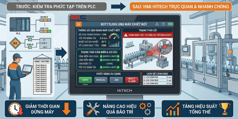 Ví dụ trong một máy chiết rót, HMI có thể hiển thị số chai đã hoàn thành, trạng thái cảm biến vào chai, cảm biến mức, trạng thái van điện từ và tốc độ băng tải. Khi phát sinh lỗi thiếu chai hoặc kẹt cơ cấu, màn hình sẽ cảnh báo ngay vị trí bất thường thay vì buộc người vận hành kiểm tra thủ công từng cụm cơ khí. Điều này giúp giảm đáng kể thời gian dừng máy và nâng cao hiệu quả bảo trì.