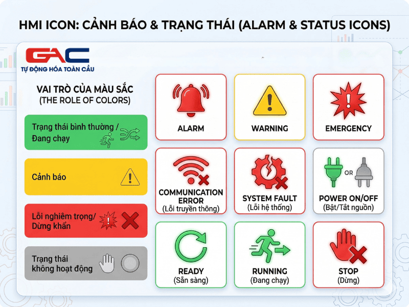 Khi người vận hành nhìn vào icon, họ phải phân biệt được ngay giữa các trạng thái này.