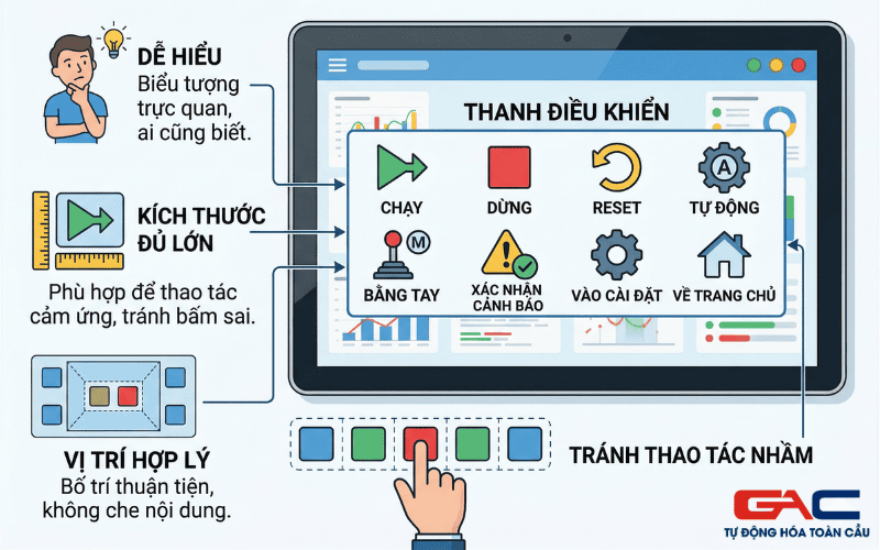 Những biểu tượng này cần dễ hiểu, kích thước đủ lớn và đặt ở vị trí hợp lý để tránh thao tác nhầm, nhất là trong các hệ thống có thao tác thường xuyên.