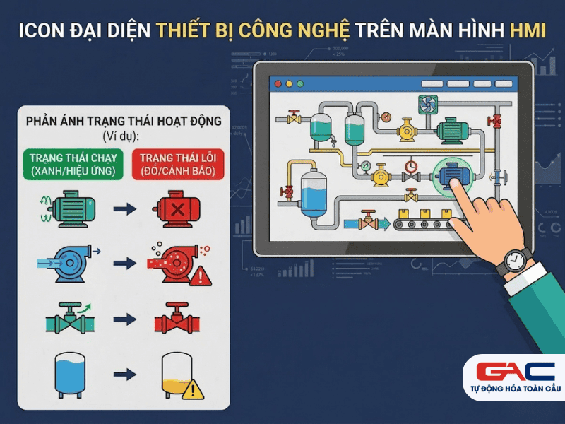 Ở những dây chuyền lớn, icon giúp xây dựng màn hình tổng quan có khả năng giám sát toàn bộ khu vực sản xuất. Chỉ cần nhìn nhanh vào giao diện, người quản lý đã có thể đánh giá khu vực nào vận hành bình thường, khu vực nào đang có lỗi hoặc cần bảo trì.