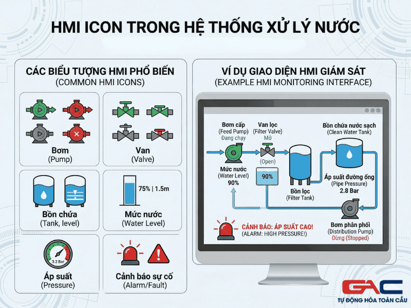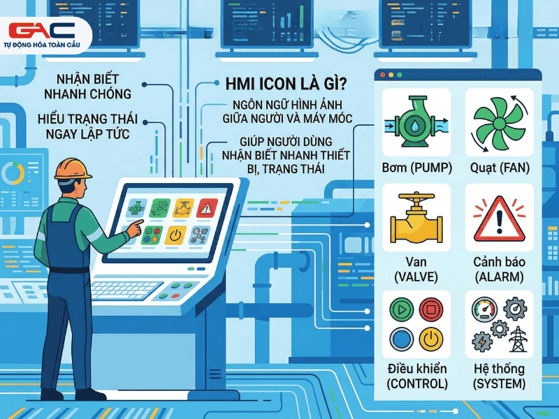 Có thể hiểu đơn giản, icon trên HMI đóng vai trò như một “ngôn ngữ hình ảnh” giữa con người và hệ thống máy móc. Khi nhìn vào giao diện, người vận hành không cần đọc hết từng dòng mô tả mà vẫn có thể nhận ra đâu là bơm, đâu là quạt, đâu là van, đâu là vị trí cảnh báo hoặc đâu là nút lệnh điều khiển.